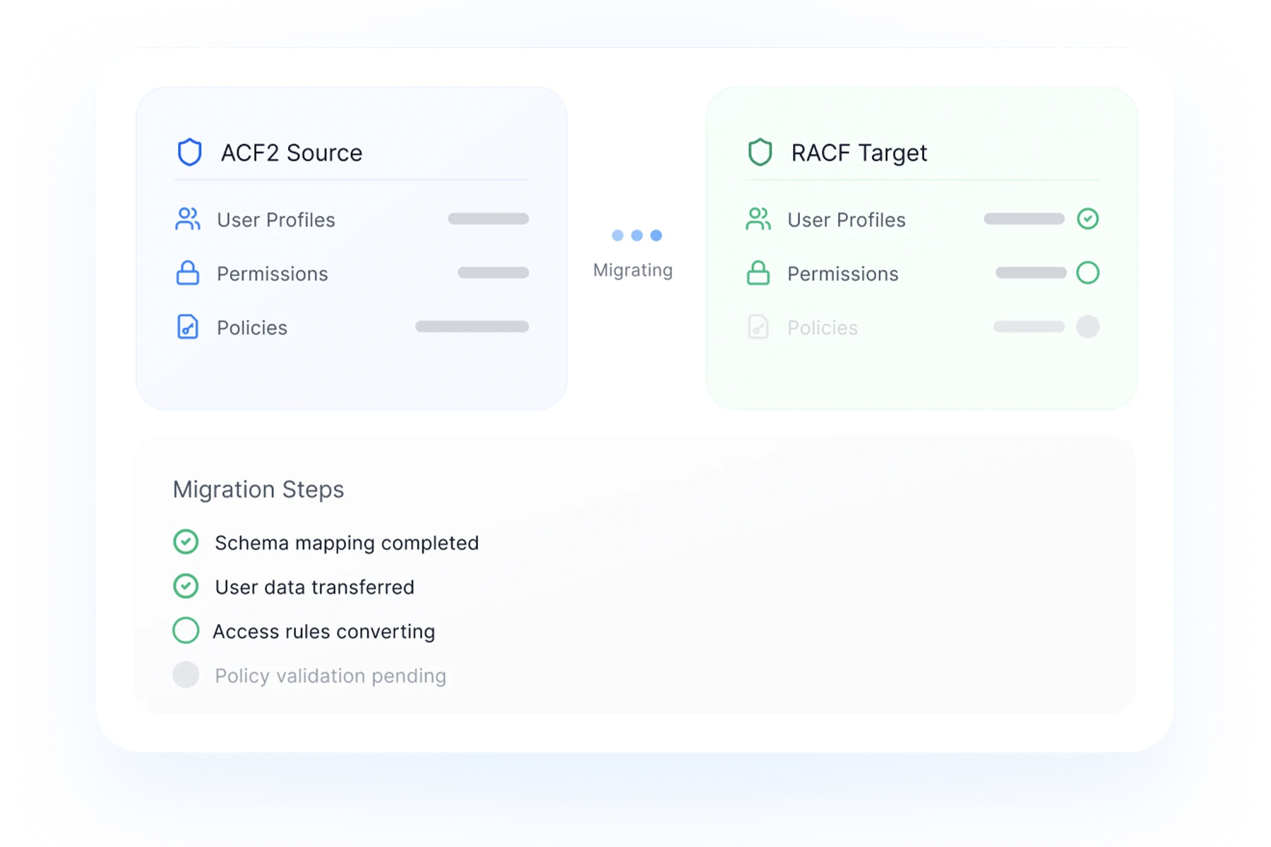 End-to-end support for ACF2-to-RACF or RACF-to-ACF2 conversion, including rules cleanup and standardization of controls.